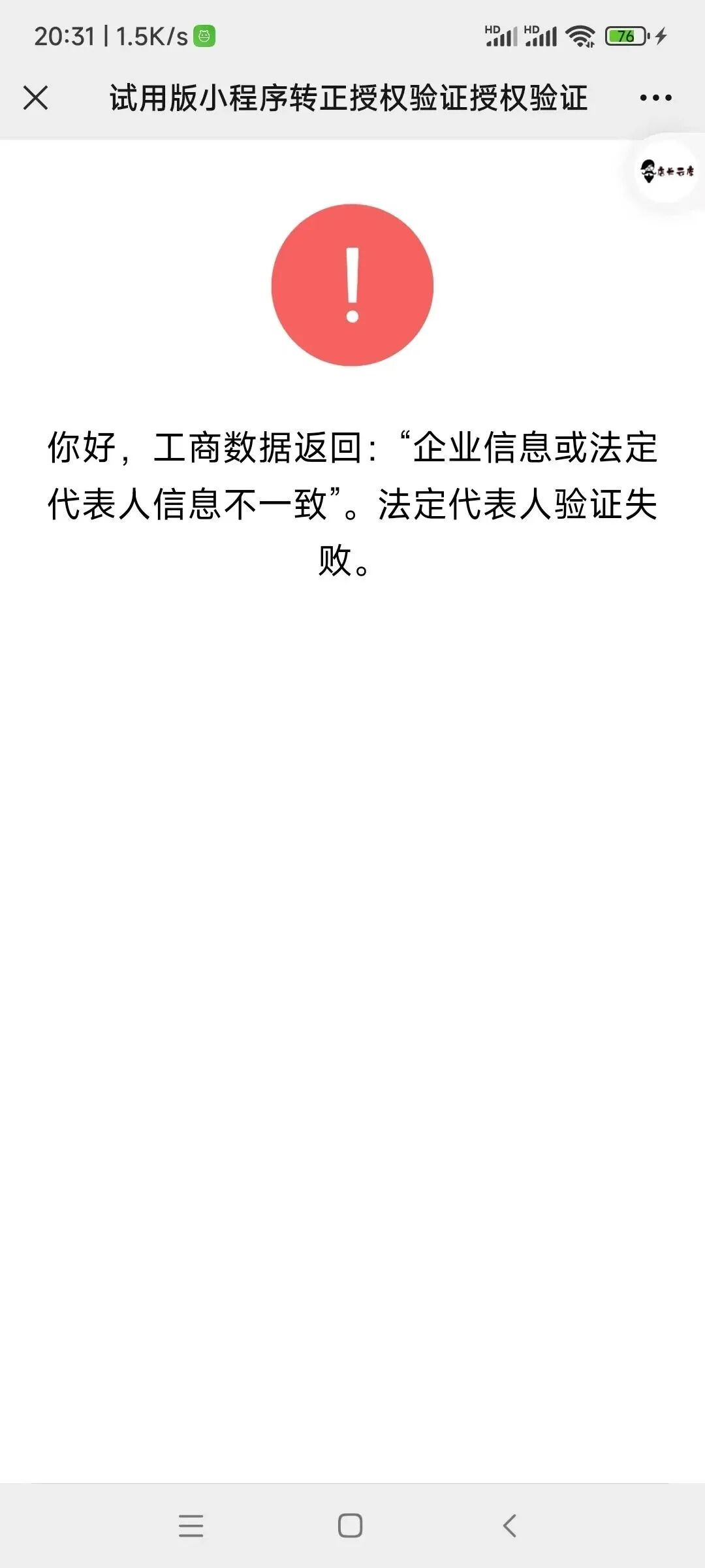 微信小程序认证时,法定代表人验证扫脸,显示“企业信息或者法定代表人信息不一致”;