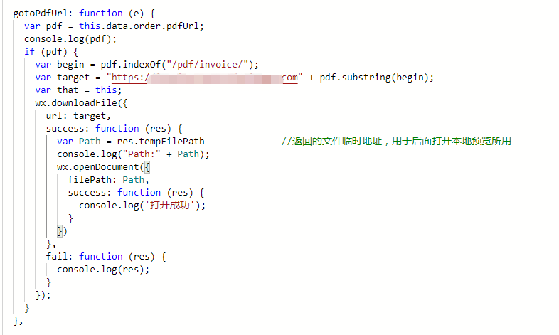 wx.downloadFile({ // 示例 url,并非真实存在 url: 'http://example.com/somefile.pdf', success: function (res) { const filePath = res.tempFilePath wx.openDocument({ filePath: filePath, success: function (res) { console.log('打开文档成功') } }) }})