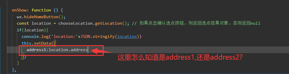 onShow:()=>{tar = wx.getStorageSync('targetAddress') || ''tar != '' && this.setData({[tar]: location.address});}