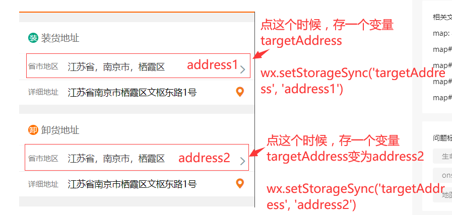 点哪个就记录一下 targetAddress呗 wx.setStorageSync('targetAddress', 'address1') 选择地址返回后 tar = wx.getStorageSync('targetAddress') || '' tar != '' && this.setData({ [tar]: location.address });若认为该回答有用,给回答者一个[ 有用 ]吧!