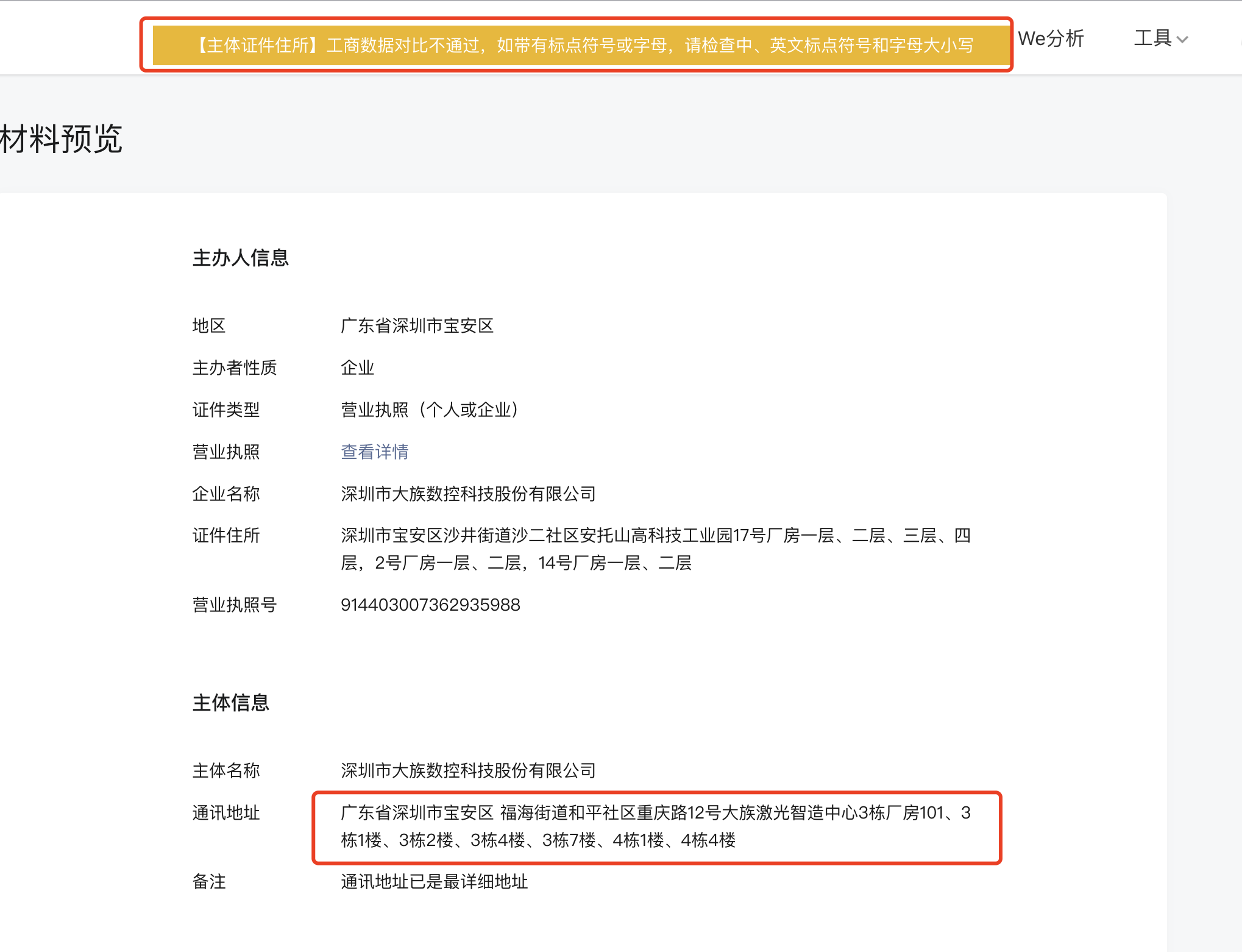 请官方人员公布下这个的解决方案,卡在这里好多天了。无论是用企查查地址,或者国家企业信用信息公示系统的地址,或者是营业执照上的地址都报这个错。请重视下这个问题。