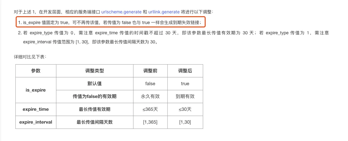 is_expire 值固定为 true,可不再传该值,若传值为 false 也与 true 一样会生成到期失效链接,可参考下之前的公告:https://developers.weixin.qq.com/community/develop/doc/000aeab88a4ea0c5c89d81fde5b801