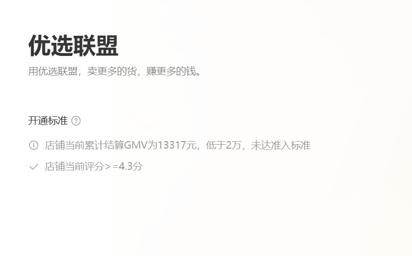 视频号小店优选联盟开通条件显示结算GMV是13000,没有达到2万,没办法开通优选联盟,可是我的账户里可提现的钱已经有6万了,这个结算GMV是怎么计算的?好心的大神教教我
