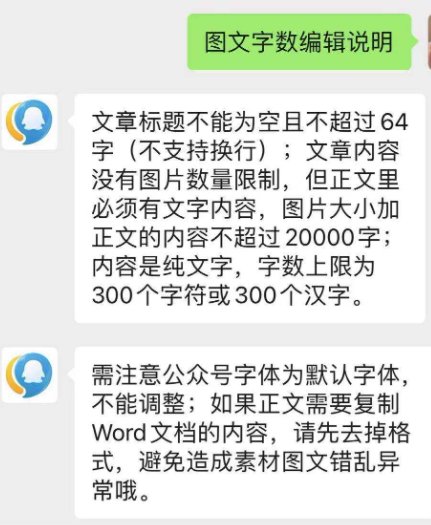 图文素材是2万字符内,但是素材内容过大,也会影响到发送。文字消息是300字符内。