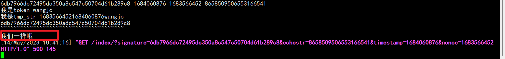 配置中点击提交时,显示token验证失败。而服务器显然已经验证签名是一样的,为什么会返回500的状态码而不是echostr