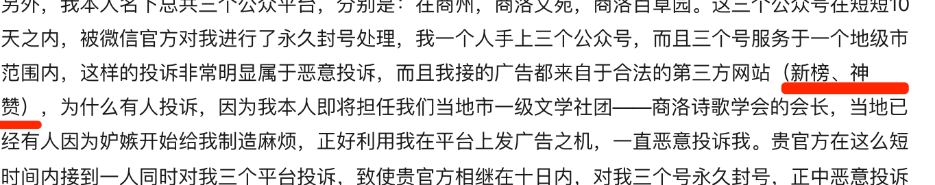 另外,我本人名下总共三个公众平台,分别是:在商州,商洛文苑,商洛百草园。这三个公众号在短短10天之内,被微信官方对我进行了永久封号处理,我一个人手上三个公众号,而且三个号服务于一个地级市范围内,这样的投诉非常明显属于恶意投诉,而且我接的广告都来自于合法的第三方网站(新榜、神赞),为什么有人投诉,因为我本人即将担任我们当地市一级文学社团——商洛诗歌学会的会长,当地已经有人因为妒嫉开始给我制造麻烦,正好利用我在平台上发广告之机,一直恶意投诉我。贵官方在这么短时间内接到一人同时对我三个平台投诉,致使贵官方相继在十日内,对我三个号永久封号,正中恶意投诉者下怀,对我非常不公,令我无法发布当地文学类作品及资讯。
