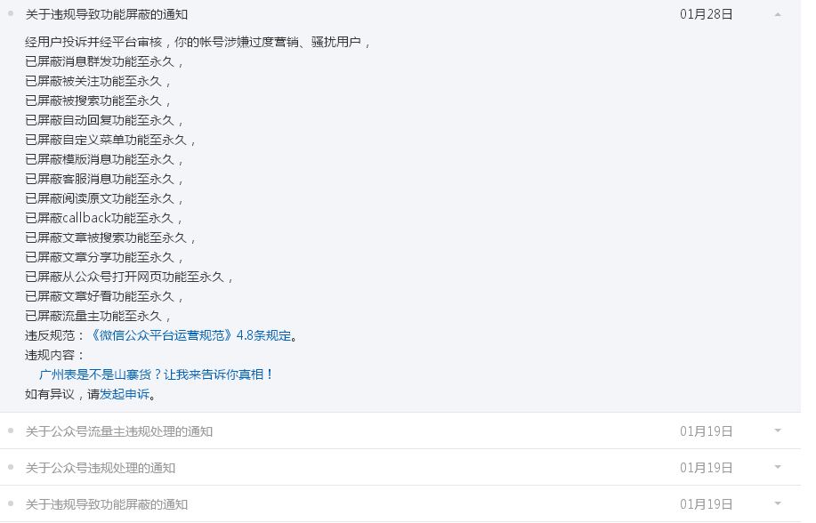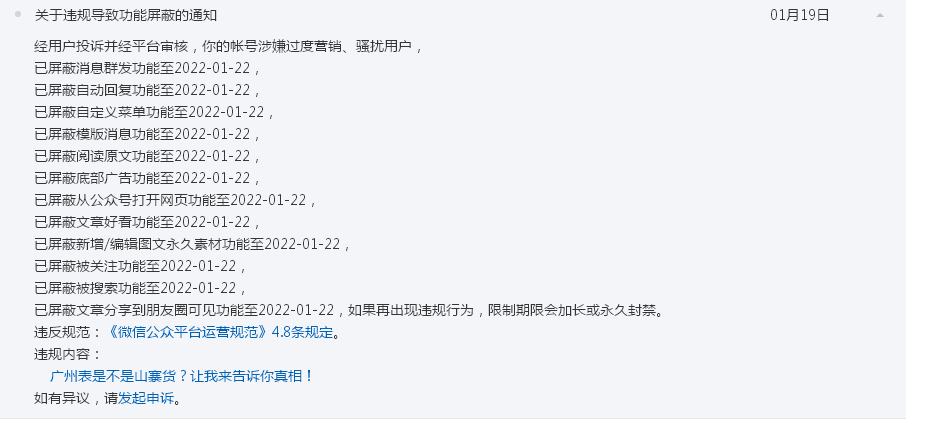 尊敬的微信官方领导:我是公众平台《在商州》运营者张胜利。2021年元月19日,贵官方,因我发布了一条标题为“广州表是不是山寨货,让我来告诉你真相!”的广告,对我实施了封号处理,屏蔽时间到元月22号。22日以后账号解封我正常发文章,一直未发广告,元月28号,贵官方突然通知,因我原已经处理过的广告二次被处理为永久封号,对此,我认为贵官方处理不当,因为一条广告已处理过,怎么又进行了二次处理,如同一个人犯法之后法院已经判决了有期徒刑,同样的案件,然后又突然判决为无期徒刑,在法律上这是说不通的。为此,本人恳请微信官方对我撤销二次处理!