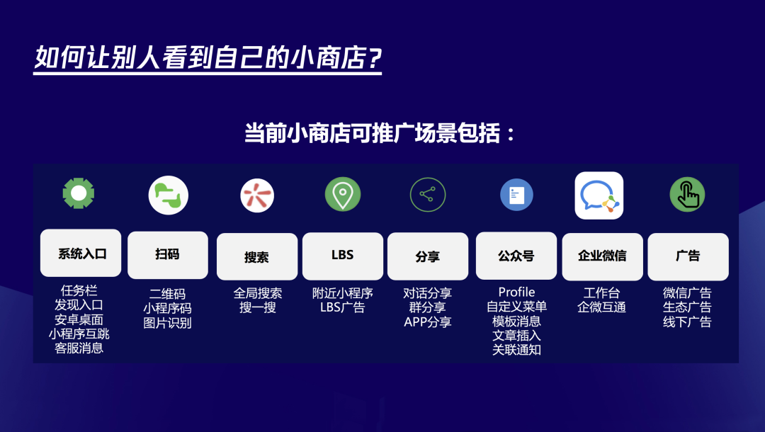 小商店曝光渠道:任务栏、发现入口、客服消息、小程序码、搜索、对话分享、群分享、APP分享、模板消息、公众号Profile页/文章插入、LBS广告、微信广告;