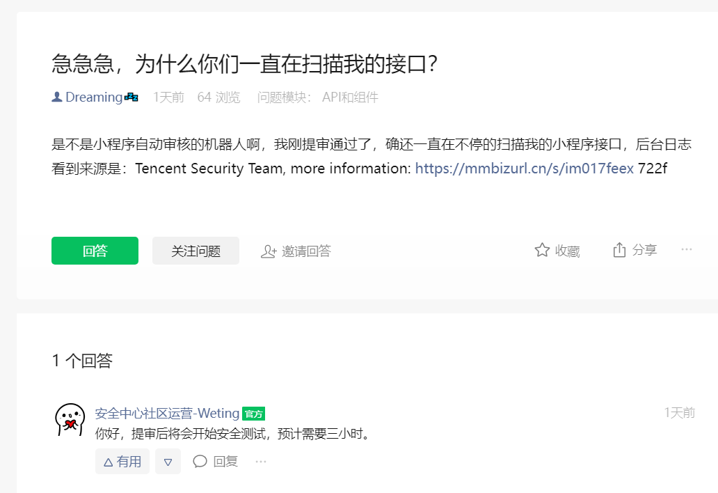 小程序发布审核时候 我们的后台会收到 来自腾讯云ip地址的请求 请求参数和借口不符会一直报错。 请求也一直不停止。这个问题请官方解答一下