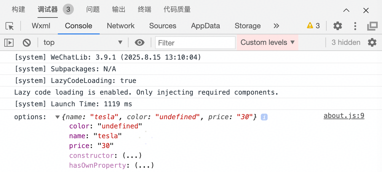 - 当前小程序 onLoad 中的 options 为 { "name": "tesla", "color": "undefined", "price": "30" }