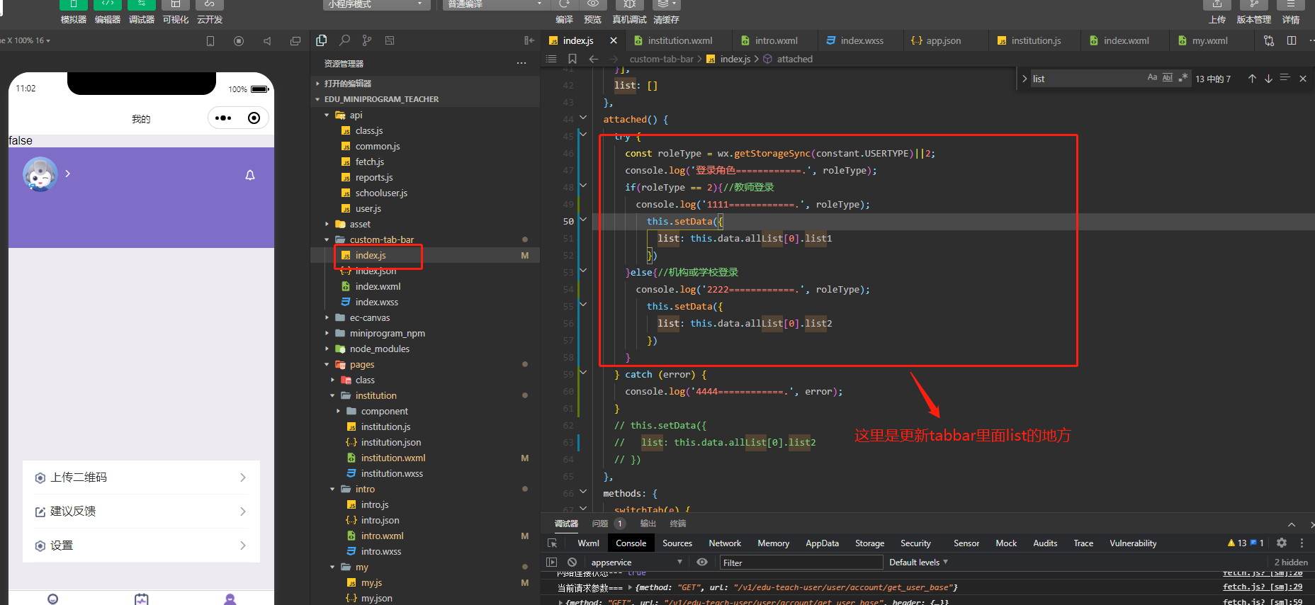 项目当中遇到这样的一个需求,根据登录的不同角色显示不同的底部tabbar。现在遇到的问题是电脑本地运行进行登录角色切换时,底部tabbar可以友好的切换,但在真机测试的时候,切换角色后第一次登录的时候底部栏显示错误,第二次登录才显示正确。角色关键字是在登录操作时候缓存的,然后在custom-tab-bar下的index.js文件获取角色字段。可以确定的是底部栏的list已经更新,只是视图没更新。