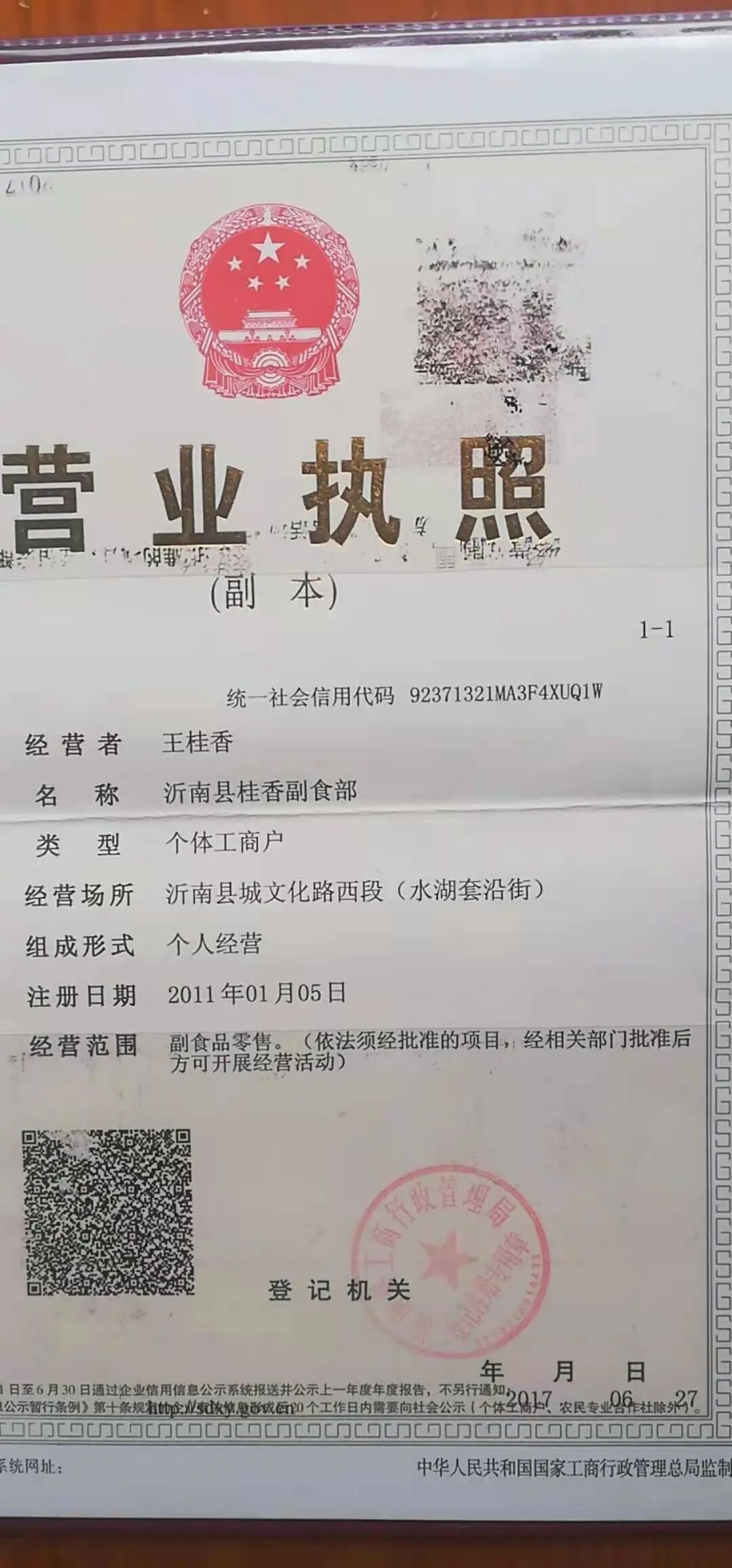 社会信用代码:92371321MA3F4XUQ1W 法人:王桂香 名称:沂南县桂香副食部