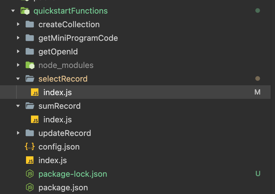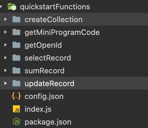 wx.cloud.callFunction({ name: 'quickstartFunctions', data: { type: 'selectRecord' } })云函数目录如下