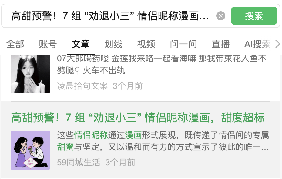 你好,经核实你的文章有被搜一搜收录,排序靠后。搜一搜的搜索结果,是根据用户需求、账号质量、文章相关性、用户实际满意度等综合维度进行索引和动态排序。