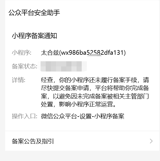 你好,核实小程序ID:wx986ba52582dfa131 未备案且已上架,若后续该小程序将暂停服务,建议可注销小程序或忽略“小程序备案通知"信息,根据自行需求选择。