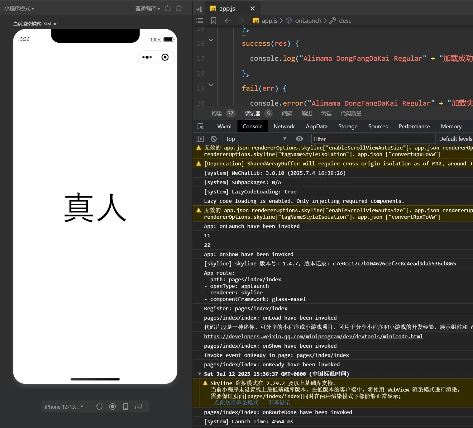 wx.loadFontFace从3.3.2已经支持skyline,安卓分别用skyline和webview都能正常显示Alimama DongFangDaKai Regular字体,就是不能触发success或fail回调函数