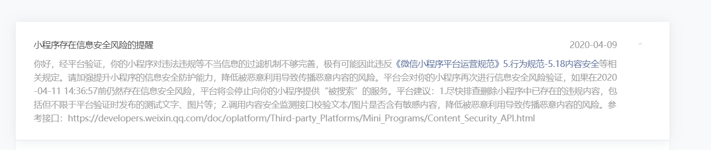 你好,经核实,你的帐号(评论)确实存在涉嫌未设置过滤违法、违规等不当信息内容的机制,请自觉遵守国家相关法律法规,不从事违法或违反《微信小程序平台运营规范》及相关规则的内容和行为,谢谢。
