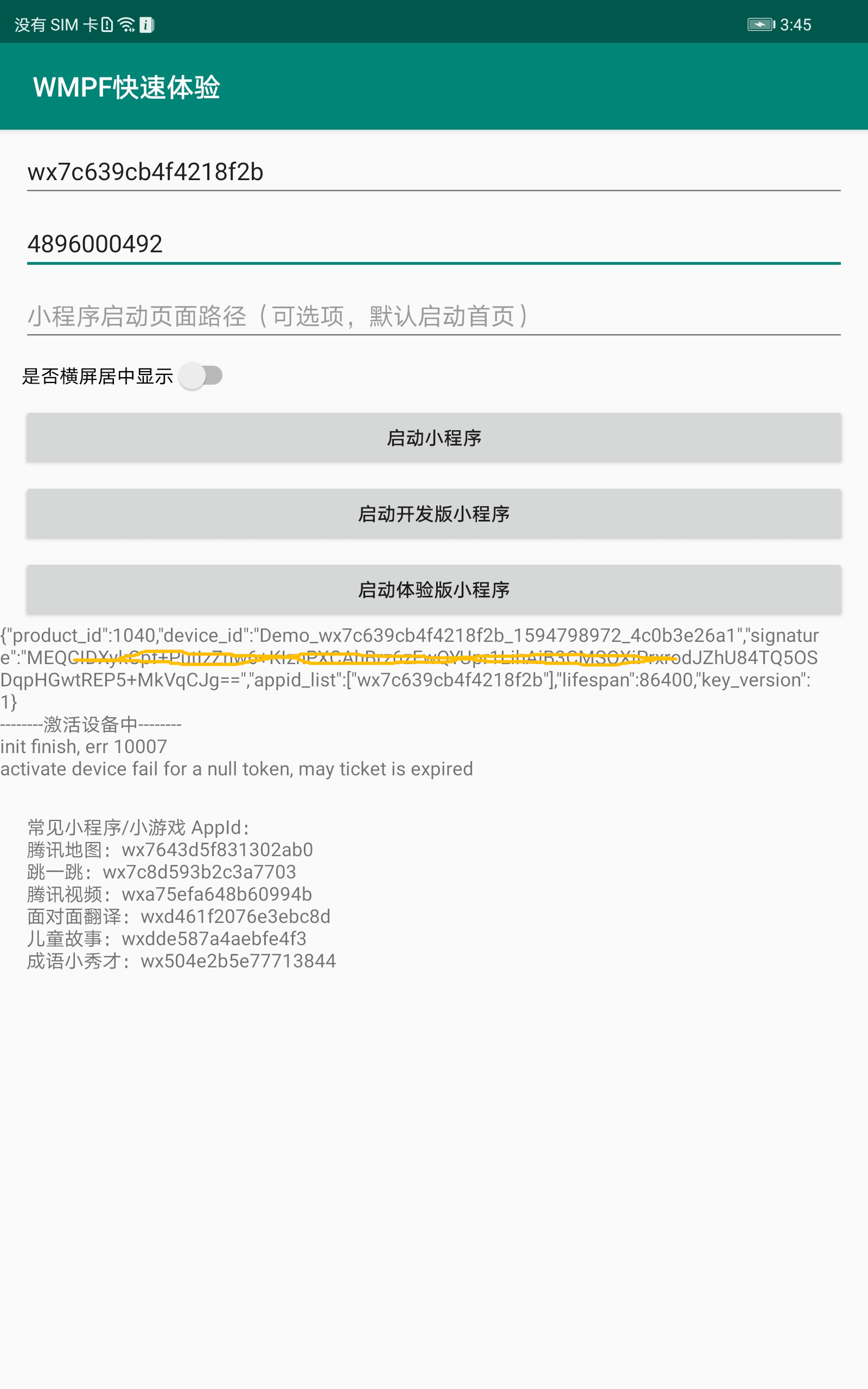 签名 和 DeviceID已参照 https://github.com/wmpf/wmpf_demo_external/wiki/%E7%A1%AC%E4%BB%B6%E6%B3%A8%E5%86%8C%E6%AD%A5%E9%AA%A4