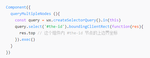 console.log(this) const query = wx.createSelectorQuery(). in ( this ) query.select( '.pp-navbar__item' ).boundingClientRect( function (rect) { // this.sliderOffset = rect[1].width; // this.setData({ // sliderOffset:rect[1].width // }); console.log( this ) console.log(rect[0].width) }).exec() |