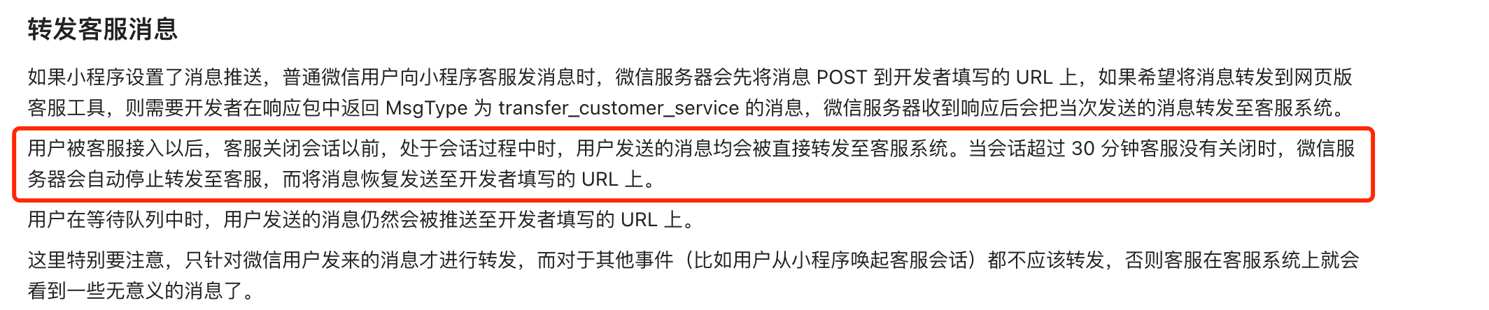 之前一直运行好好的,最近小程序客服工具更新后,出现了以下问题。客服消息转发到官方小程序客服工具,人工客服接入后,用户之后的消息还会发到我们服务器,还会进行关键字自动回复,而人工客服无法收到此类消息(因为自动回复类都设置为不会转人工)。这跟官方文档不符。