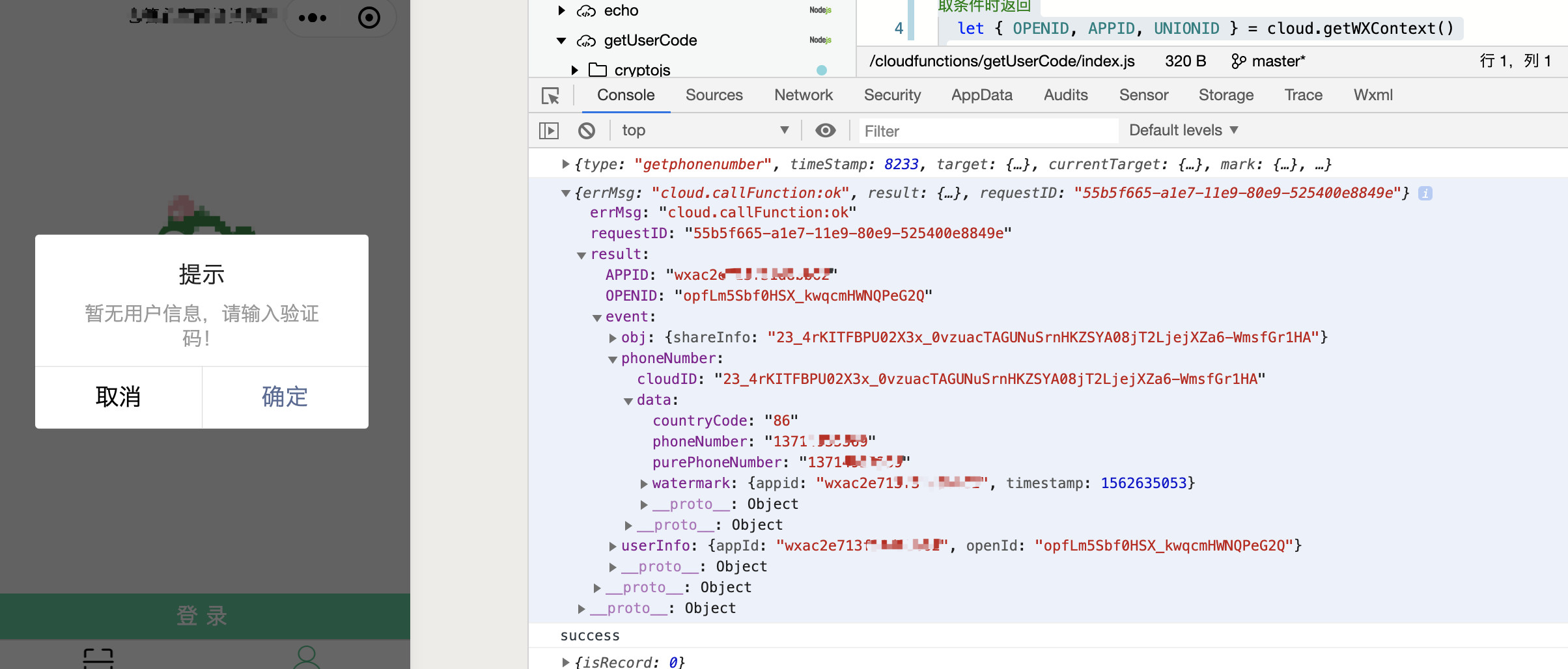 在客户端上使用,获取到的phoneNumber信息里面,咩有cloudId信息,然后导致,调用云函数的时候报错了。在开发工具调试的时候,是没有问题的。