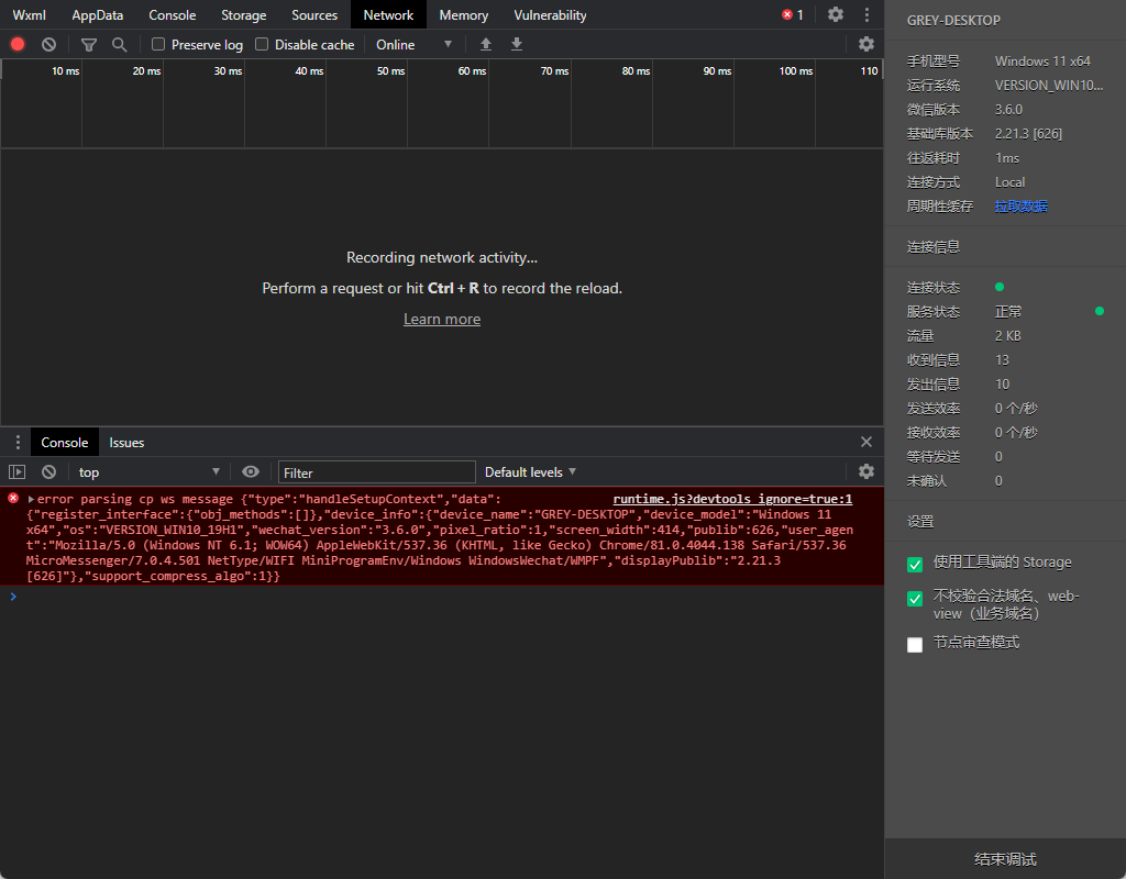 error parsing cp ws message {"type":"handleSetupContext","data":{"register_interface":{"obj_methods":[]},"device_info":{"device_name":"GREY-DESKTOP","device_model":"Windows 11 x64","os":"VERSION_WIN10_19H1","wechat_version":"3.6.0","pixel_ratio":1,"screen_width":414,"publib":626,"user_agent":"Mozilla/5.0 (Windows NT 6.1; WOW64) AppleWebKit/537.36 (KHTML, like Gecko) Chrome/81.0.4044.138 Safari/537.36 MicroMessenger/7.0.4.501 NetType/WIFI MiniProgramEnv/Windows WindowsWechat/WMPF","displayPublib":"2.21.3 [626]"},"support_compress_algo":1}}