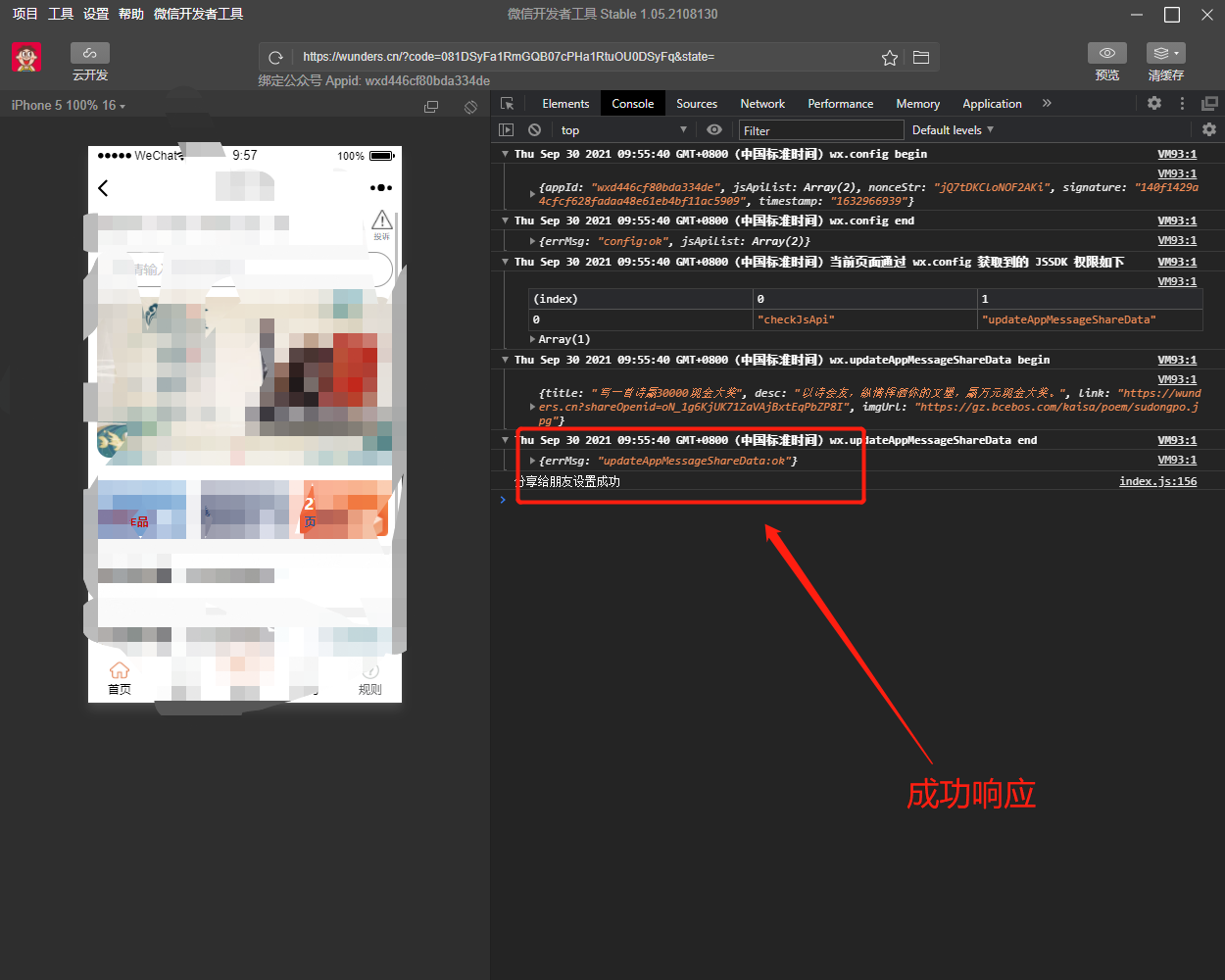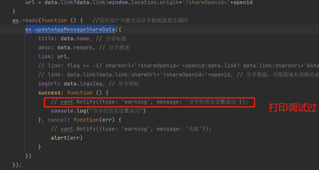 都是成功,并且线上debugger,在wx.ready内部 wx.updateAppMessageShareData这个api内部进入success内部,也正常打印提示过成功,下面是代码和编辑器的效果图。