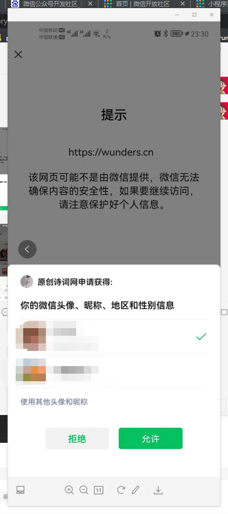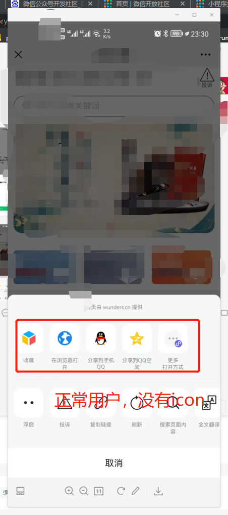 tips: 这套分享代码已经正常运行了将近一年了,从来没有问题过,从放开验证后,就一直反复提示不是由微信提供,和分享是两个icon不显示的情况