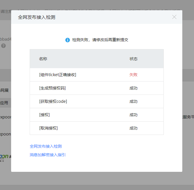 之前开发的时候一直可以正常接收到ticket,然后昨天调试全网发布,ticket不知何故检测失败后,接收不到微信的推送了。全网发布也一直报失败。