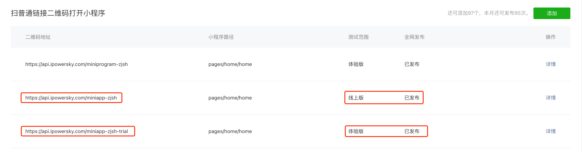 配置了 2 个二维码地址,一个体验版,一个线上版。
