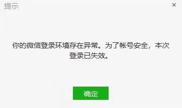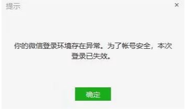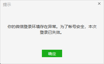 登录环境异常,本次登录失效,请重新登录”的问题,重新扫码登录即可,出现该提示一般是由于微信帐号被其它用户投诉导致(如:涉嫌频繁发送营销类广告骚扰信息等,请遵守微信使用规则,并规范个人行为,谢谢!)