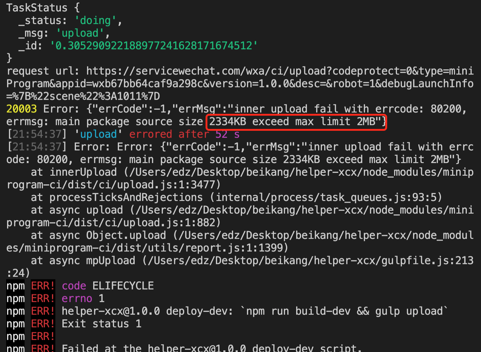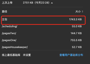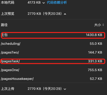 先解决方案将主包a文件分包处理:pagesTask文件,上传成功,显示主包大小为1.4M,pagesTask分包为331k,这加起来还是1.7M左右