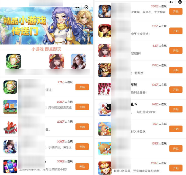 违规示例:该类违规小程序内无实际运营内容,其核心业务是提供一个/少量/大量小游戏集中排列展示推荐、设立跳转的服务。