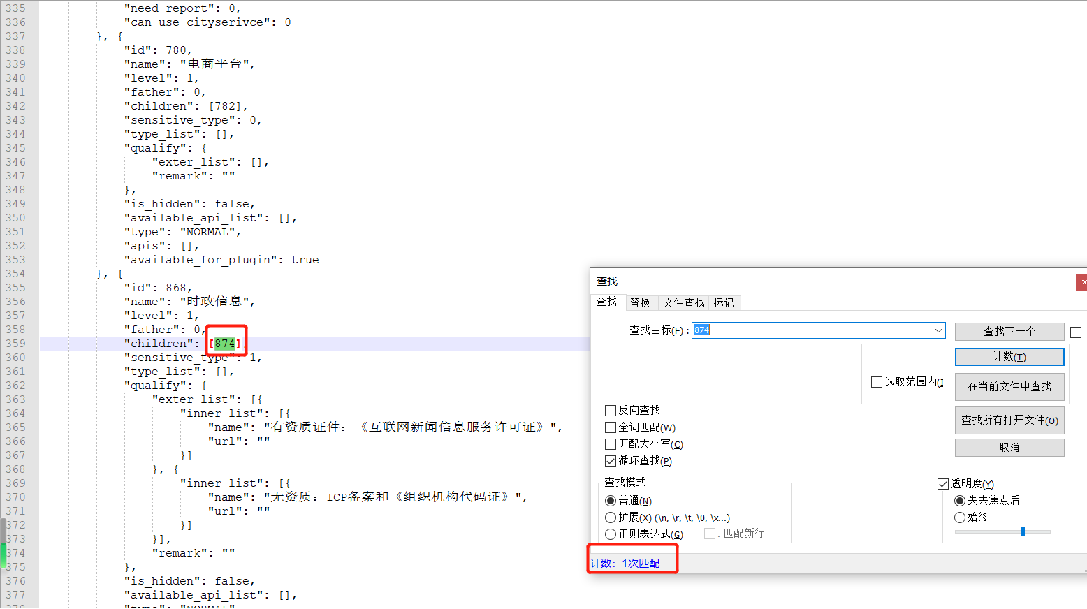 接口的返回值:一级类目有时政信息,其二级类目的id为874,但是搜不到id为874的二级类目