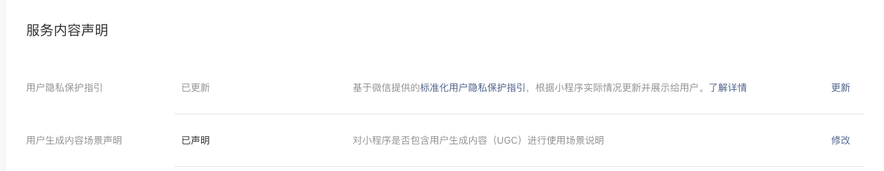 第三方服务商:https://developers.weixin.qq.com/doc/oplatform/openApi/OpenApiDoc/miniprogram-management/privacy-management/setPrivacySetting.html
