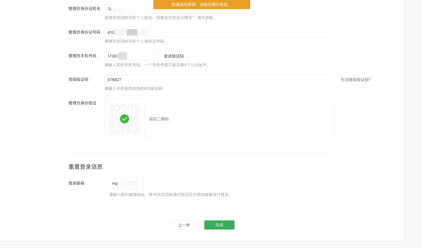 在公众号平台,申请找回账号,提示“数据查询异常,请联系客服”,请问这是什么情况?如何联系公众号客服?