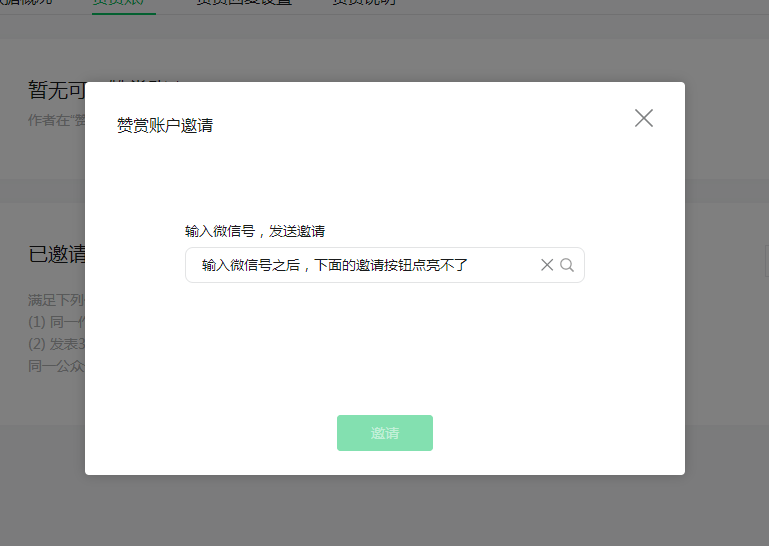 原创超过三篇了,显示赞赏升级,但是邀请按钮是灰绿色,点亮不了是什么问题