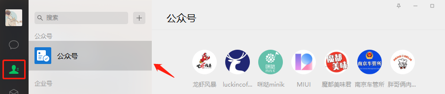 1、打开PC版微信客户端,点击联系人,找到公众号,如下图: