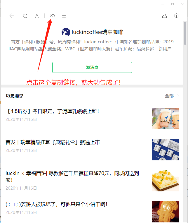 3、接下来会跳转到公众号的主页,此时窗口的左上角就有这个主页的复制链接按钮