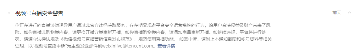 你好,我们已对你提交的申诉材料进行复核,你在2021-08-14 15:51:06发起的直播未挂官方购物组件,平台对你进行了警告提醒。后续请注意合理使用,请遵守《微信视频号主播行为规范》以及《微信视频号直播功能使用条款》。同时,电商类型直播请遵守《微信视频号主播营销信息发布规范》。
