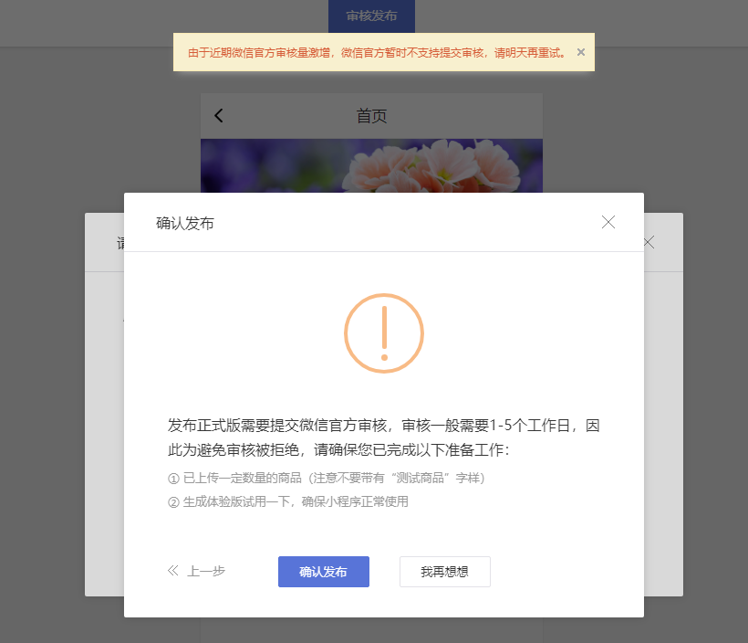 由于近期微信官方审核量激增,微信官方暂时不支持提交审核,请明天再重试?