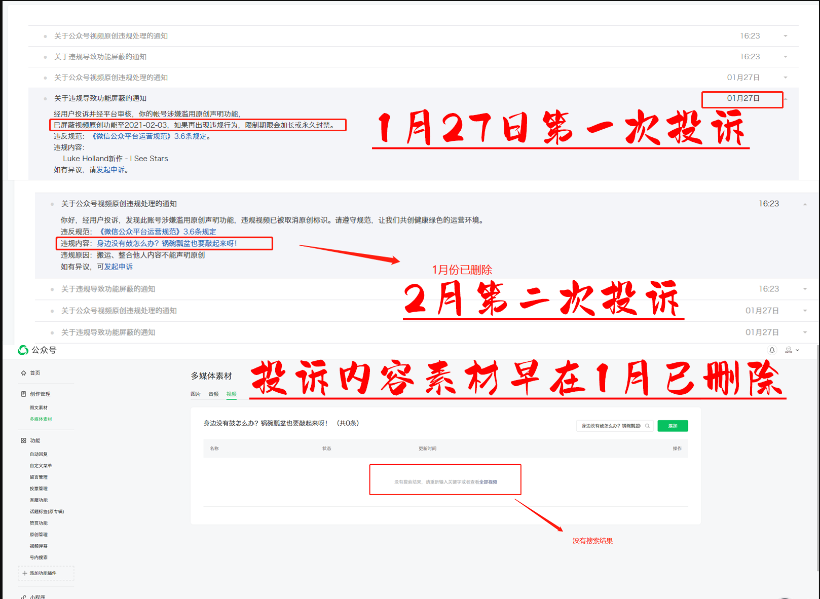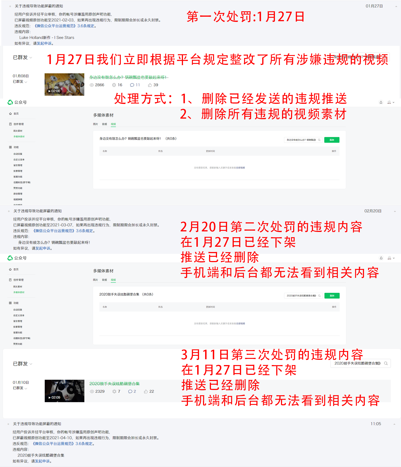 之后分别在2月20日和3月11日分别收到两条相同类型的处罚通知 处罚的内容是1月27日已经下架的违规视频 早已经看不到了