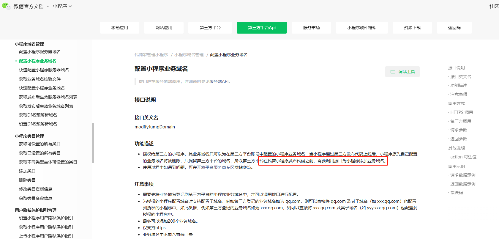 调用的是https://developers.weixin.qq.com/doc/oplatform/openApi/OpenApiDoc/miniprogram-management/domain-management/modifyJumpDomain.html这个接口