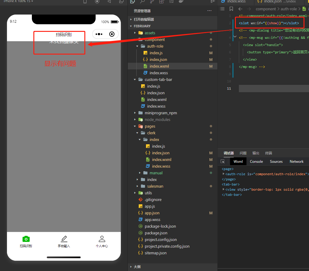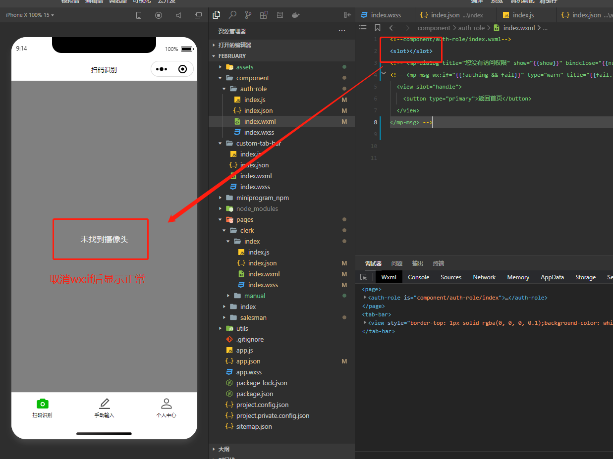 我将所有页面都套在auth高阶组件中判断身份,我发现一个问题,当给slot设置wx:if的时候,"未找到相机"这几个字显示在最顶部