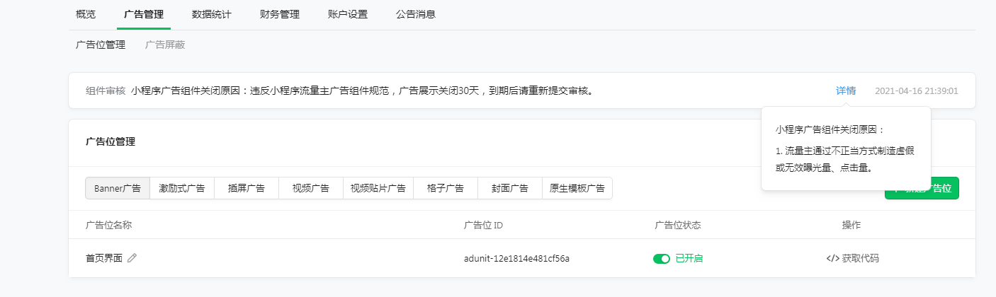 来自一位刚刚运营小程序的人的感言,这个小程序所有的流量点击都是正常正规渠道投放得来的,没有经过任何虚假的,我所有的流量都对得起自己的良心,对得起腾讯的查验,就在今天微信上有个朋友聊了一下他点击广告的事情,有录音为证,我还劝他做真实的别乱来,因为他微信多,有录音为证,不能因为我劝别人不做虚假,在微信聊天里面说了这些,给他分析了划不来,要封号等等就把我的小程序封了吧,第一次做腾讯小程序,从来没有想过走其他路,都是想堂堂正正的走到底,突然我的小程序就关闭广告提示,说我违规虚假推广了,尊敬的腾讯审核员,如果需要录音我还可以把录音提供出来,自己录音了,真的没有任何虚假推广,有虚假推广我被封毫无怨言,我发誓虚假推广就出门被车撞si!真的挺觉得无辜的,感觉钱也拿不回来,就像养大的孩子突然一下被否定,一言难尽!