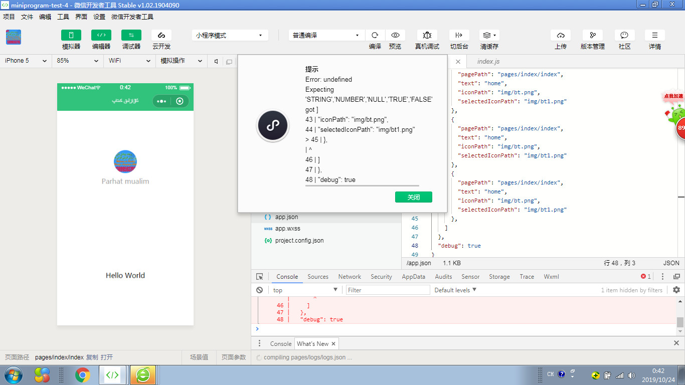 大家好!我是一名新手。在学习过程中写了一个tabBar.写完后无法在模拟器里浏览。console栏里始终提示 getUserInfo. 我该如何解决这个问题呢?求各位大神给予帮助,谢谢大家