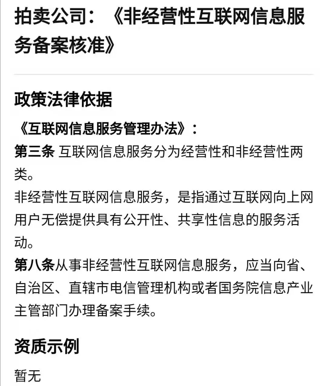 拍卖公司(非文物) 这个要三个证书 其中一个是 《非经营性互联网信息服务备案核准》这个是非经营性的