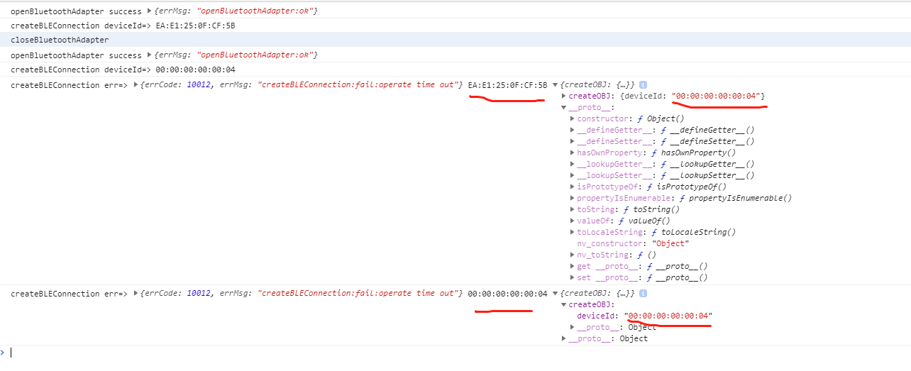 - 请保证尽量成对的调用 createBLEConnection和closeBLEConnection接口。安卓如果多次调用createBLEConnection创建连接,有可能导致系统持有同一设备多个连接的实例,导致调用closeBLEConnection的时候并不能真正的断开与设备的连接。