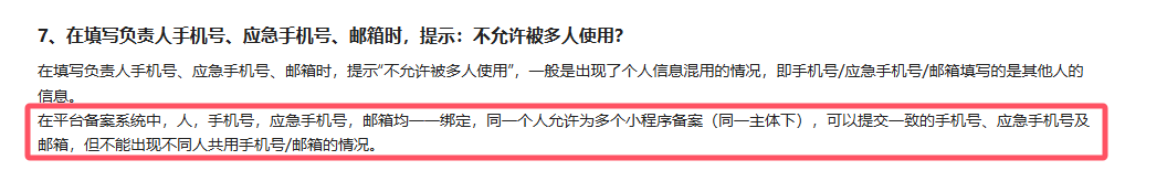 你好,在平台备案系统中,人,手机号,应急手机号,邮箱均一一绑定,同一个人允许为多个小程序备案(同一主体下),可以提交一致的手机号、应急手机号及邮箱,但不能出现不同人共用手机号/邮箱的情况。