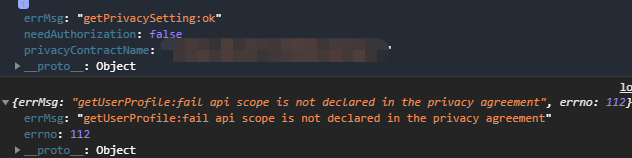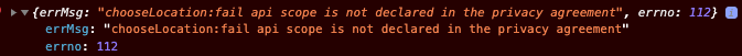 { "errMsg": "A:fail api scope is not declared in the privacy agreement", "errno": 112 }